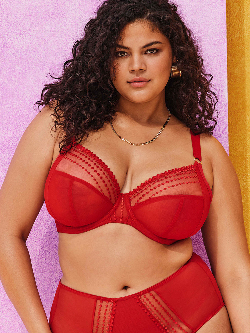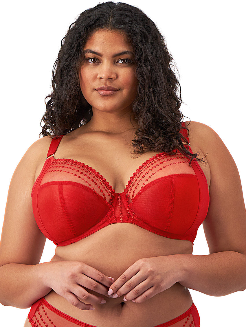 Matilda is a classic Elomi style that provides the support we all know and love, with an added twist of mesh material throughout to elevate it's overall look and feel. This plunge style underwire bra features embroidery along sheer top panels of the cups and silvertone metal rings at base of straps for added luxury.