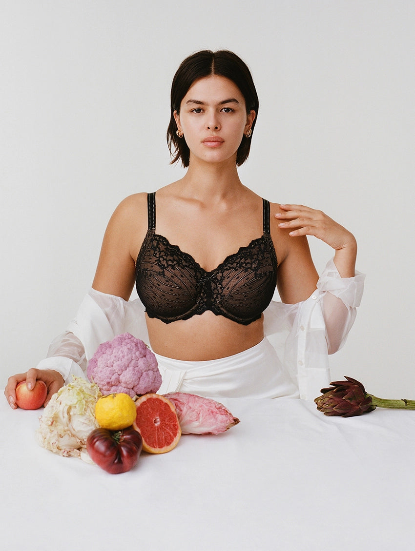 A Chantelle best seller, the Rive Gauche Full Coverage Unlined Bra is a must-have for maximum comfort and support. The ultra light, non-padded, full coverage cups are made of comfortable, soft stretch lace that adjusts to your shape. Angled seaming on the cups provide maximum lift and support, and center the breast tissue, creating the look of a longer, thinner waist.