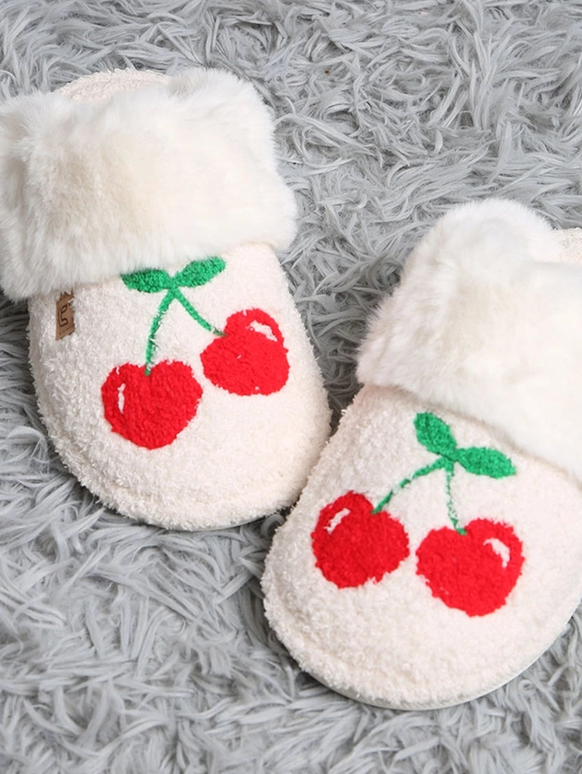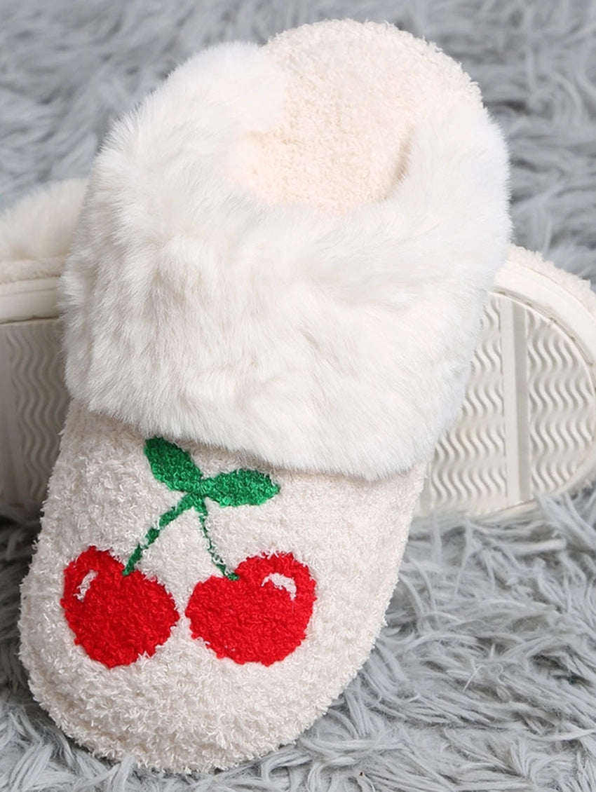 Slip into something comfy and cute with the Comfy Lux Cherry Slippers. Featuring lightweight slippers, with cherry embroidery, plush lining, and faux fur trim.