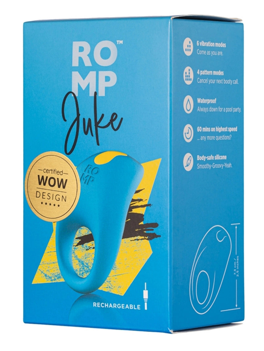 Introducing the ROMP Juke! The ROMP Juke is a vibrating penis ring that gives intense pleasure to all parties involved by stimulating both the penis and the clitoris during play. ROMP Juke is whisper quiet, fully waterproof, and velvety smooth for a discreet fun time even in the shower or tub and it's quick charging won't leave you hanging in desperation.