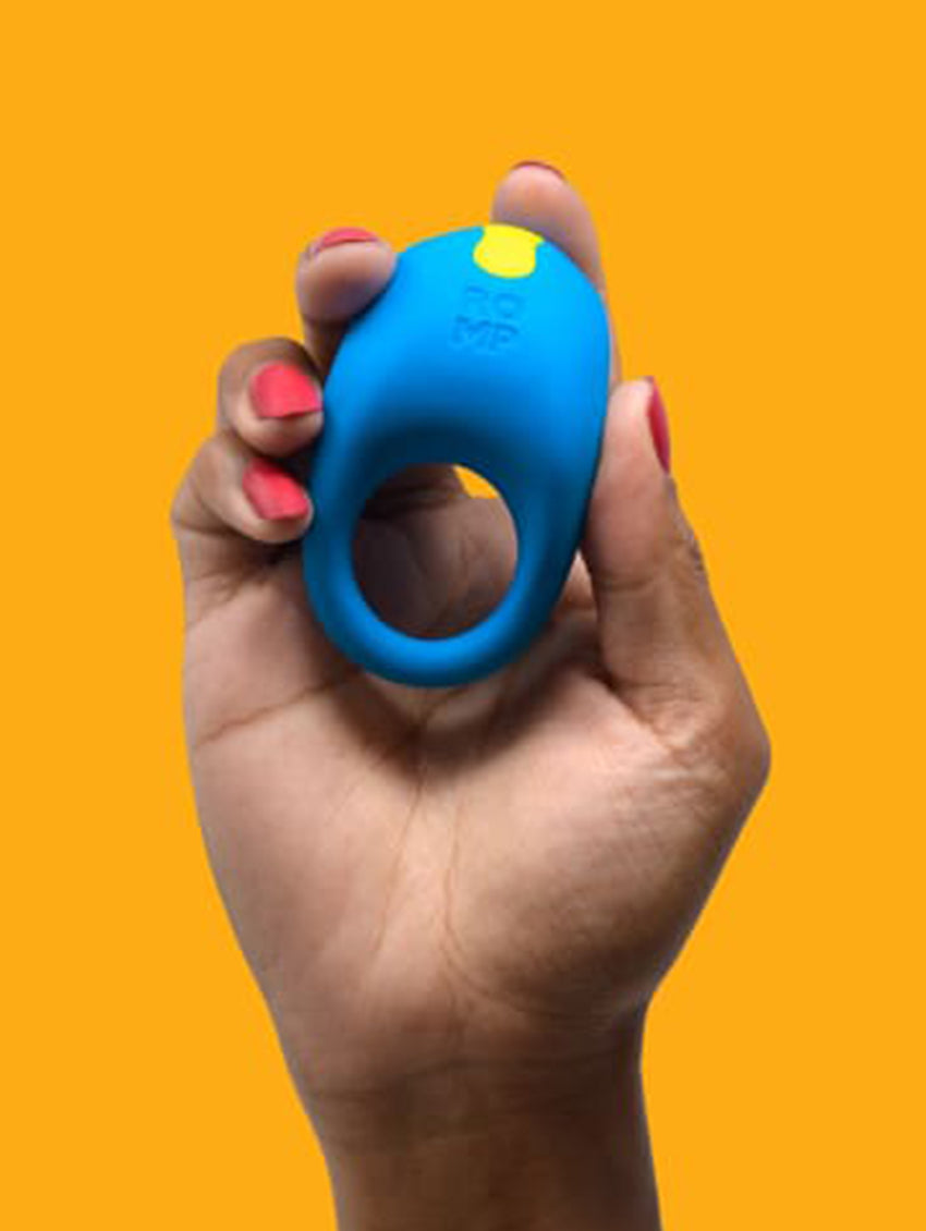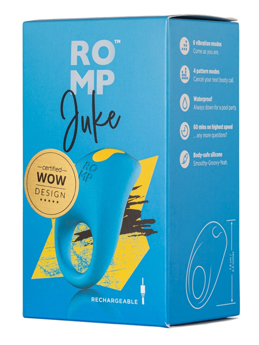 Introducing the ROMP Juke! The ROMP Juke is a vibrating penis ring that gives intense pleasure to all parties involved by stimulating both the penis and the clitoris during play. ROMP Juke is whisper quiet, fully waterproof, and velvety smooth for a discreet fun time even in the shower or tub and it's quick charging won't leave you hanging in desperation.