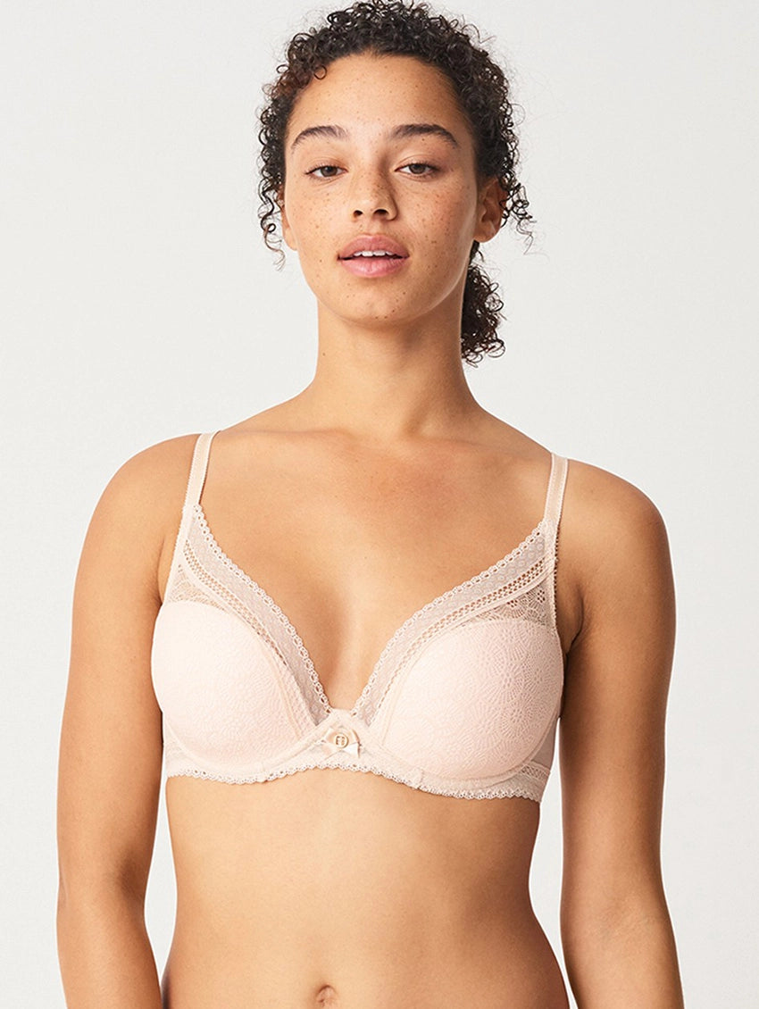 The Chantelle Festivite T Shirt Bra is luxuriously detailed and designed. This contour bra surrounds you in lace and soft comfort. Made of nylon and elastane, the contour/t-shirt underwire cup has light padding for shape and coverage and beautiful lace cups.