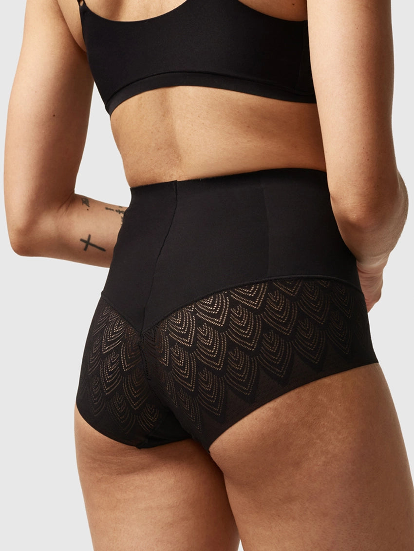 An ultra smooth high-waist shaping brief by luxury Parisian brand, Chantelle. This brief sits at the natural waistline and features semi-sheer coverage in the back. Offering light smoothing and shaping through the stomach and lower back, it's a perfect option under that pencil skirt or cocktail dress. It's even light enough to be worn on hot days. This shaper has beautiful lace cut outs on the hips that extend through to the back in a flattering scalloped design.