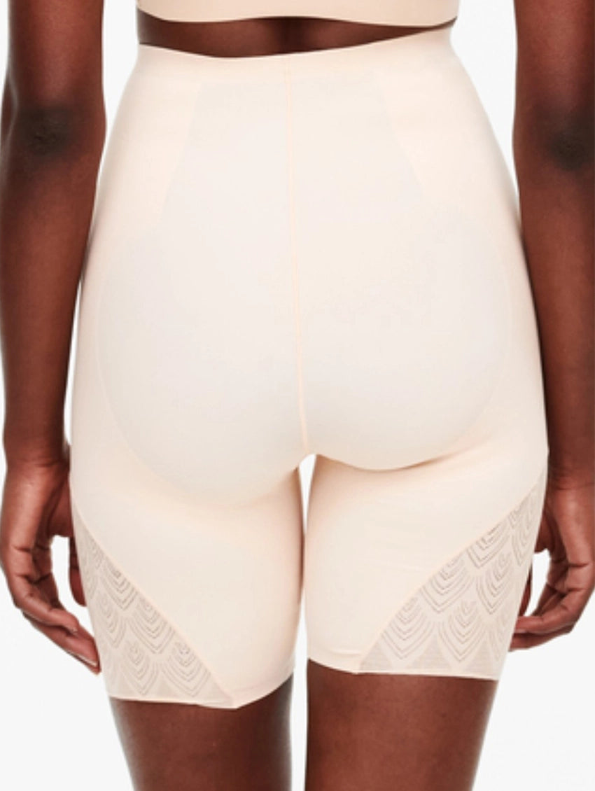 An ultra smooth high-waist shaping short by luxury Parisian brand, Chantelle. This short sits at the natural waistline and features a double layer that frames the bottom for a lifting effect. Offering light smoothing and shaping through the stomach, lower back, and thighs, it's a perfect option under that pencil skirt or cocktail dress. It's even light enough to be worn on hot days. This shaper has beautiful lace cut outs on the thigh in a flattering scalloped design.