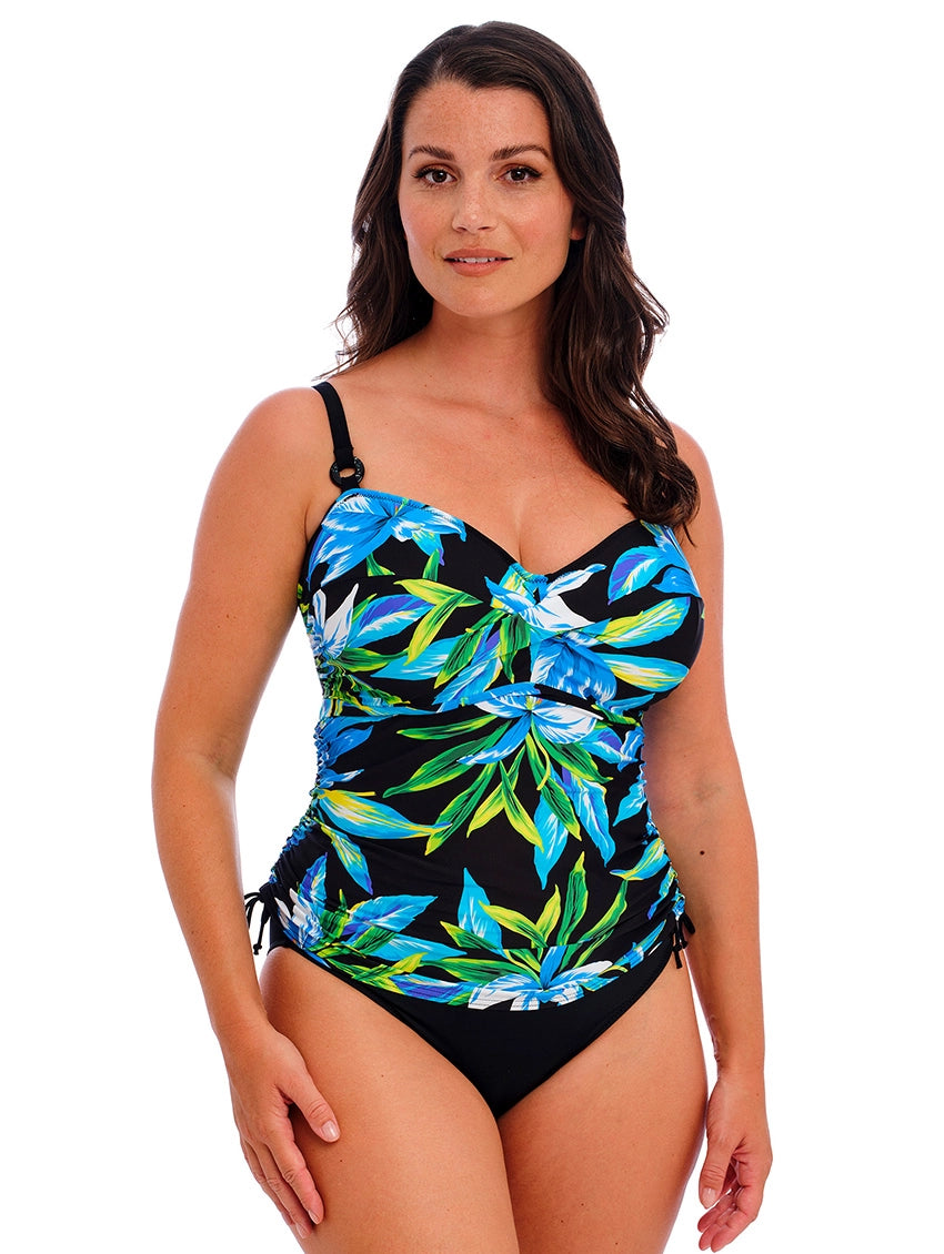 Vacation never felt so good in the Fantasie Talm Beach Twist Tankini. Featuring a bold tropical print, flattering side ties and twist front, adjustable shoulder straps, and hidden underwire for support and separation. Mix and match with your favourite Fantasie bottoms.
