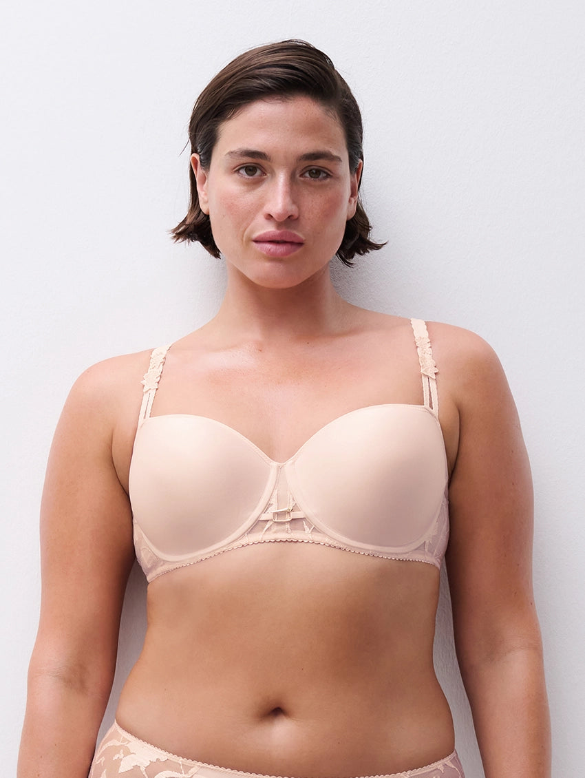 An everyday essential with a soft romantic twist in the Chantelle Idylle Bra. Designed with sheer tulle and floral embroidery for a touch of luxury, and a moulded balconette shape that offers a smooth silhouette under low neckline tops.