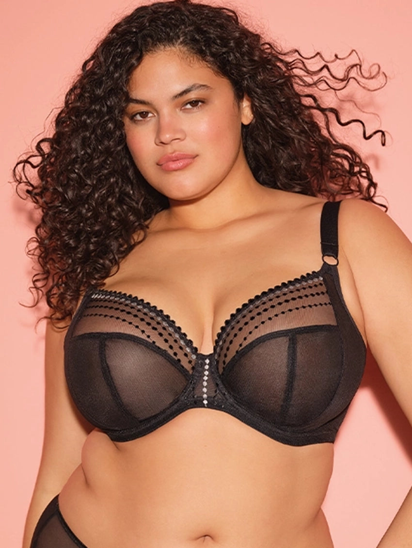 Matilda is a classic Elomi style that provides the support we all know and love, with an added twist of mesh material throughout to elevate it's overall look and feel. This plunge style underwire bra features embroidery along sheer top panels of the cups and silvertone metal rings at base of straps for added luxury.