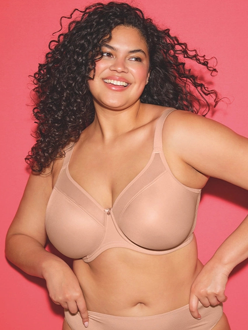 A lingerie staple, meet Elomi's Smooth Bra in neutral Sahara shade. Crafted from ultra-light Aerocool fabric to keep you cool and dry, while the tulle top cup gives a lighter look to the must-have style.