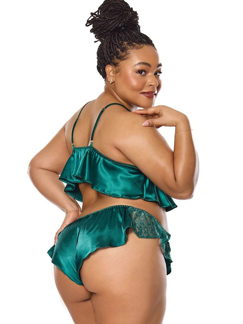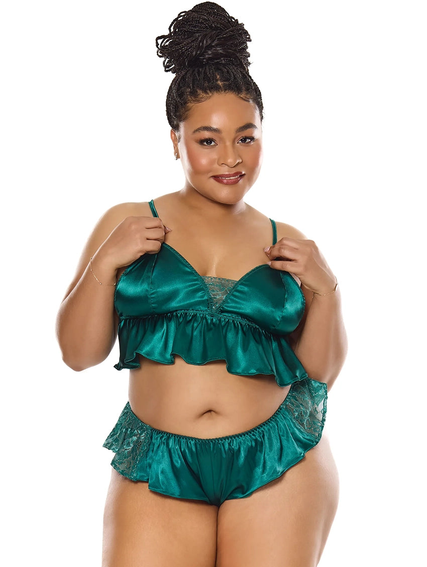 The Jade Bralette and Panty Set from Coquette is perfect for when you want something fun and flirty! With cute ruffle details, a peplum hem top, and gorgeous green satin and lace, it's hard to say no to this fun lingerie piece.