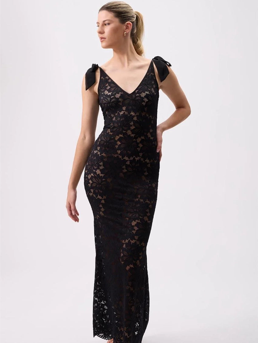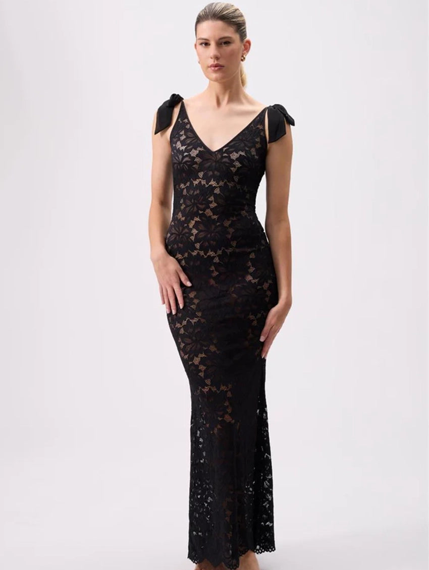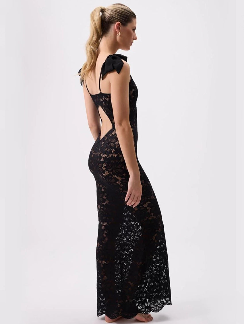 Serve body and drama in the Rya Collection Amour Gown. Crafted from luxurious stretch floral lace and adorned with soft chiffon bow details, this gown features a seductive keyhole back and a body-hugging silhouette that flatters every curve. Perfect for seductive evenings or styled boldly as statement outerwear.