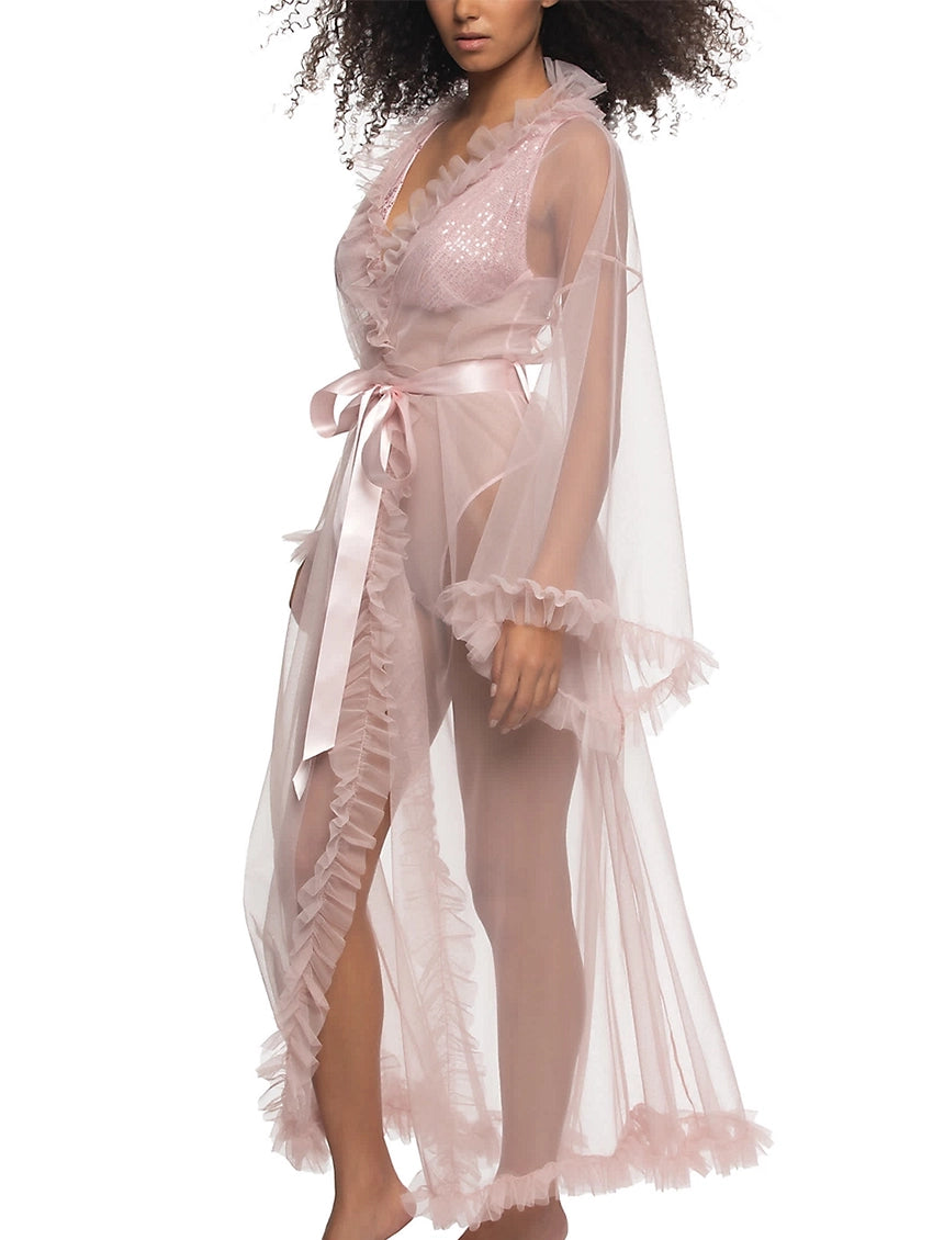 The Veil Tulle Ruffle Robe from Jezebel is and playfully elegant piece. It features a stunning floor length, sheer tulle with ruffle trims, and a waist tie made from soft satin. This voluminous robe is the perfect addition to your lingerie wardrobe.