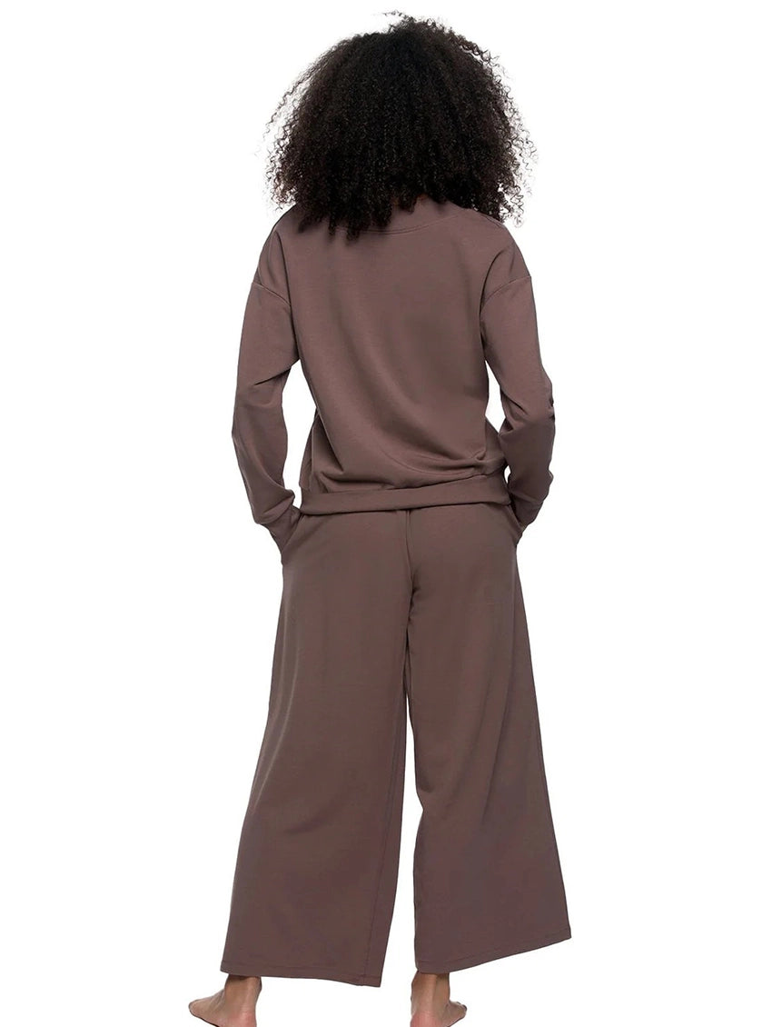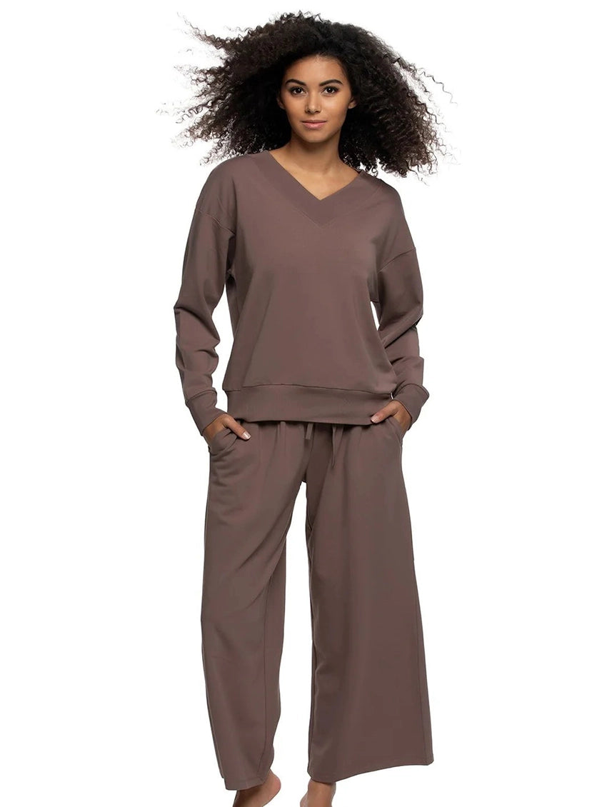 This modern lounge set will be your new favourite weekend uniform throughout fall and winter. Upgrade your loungewear with this set, featuring high-waisted pants and v-neck long sleeve top. The drop-shoulder sweater design and wide-leg pants create a relaxed vibe and the soft, heavyweight fabric is ultra cozy.