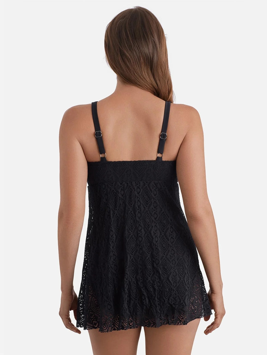 Sculpt and flatter your silhouette with a modern style in the Shape Solver Crochet Au Lait Swimdress. Made with sewn-in soft cups, power mesh shelf bra, and tummy control panel to help you feel confident from every angle.