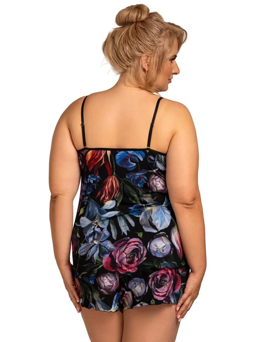 The Nessa Fibi 2 Piece PJ Set is a simple cami top and shorts in a gorgeous floral print. With smooth, comfortable fabric in a vibrant floral print on a black background, and a loose fit, this pajama set is a simple and perfect choice for an easy sleep.