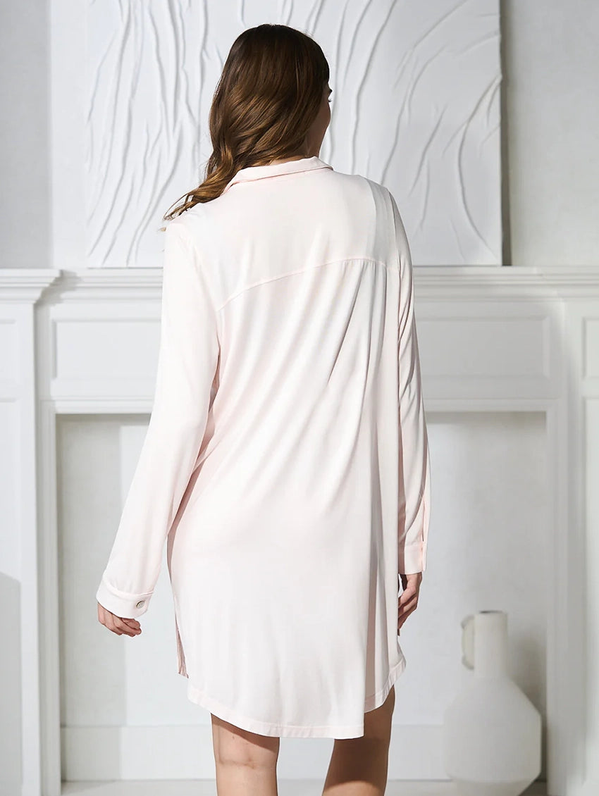 Lounge or sleep in ultra comfort in the Catalfo Boyfriend Sleep Shirt. Made with lightweight and breathable modal, button front and long sleeves, front pockets, and mid thigh length.