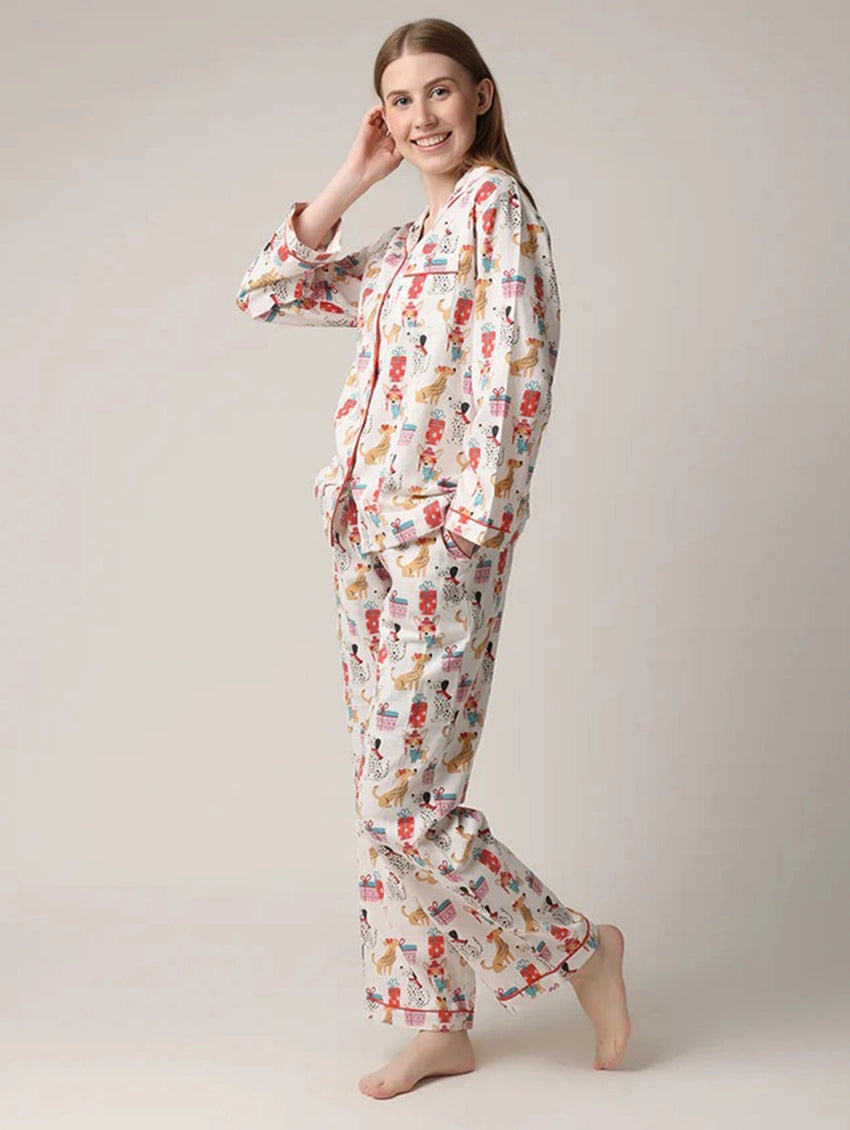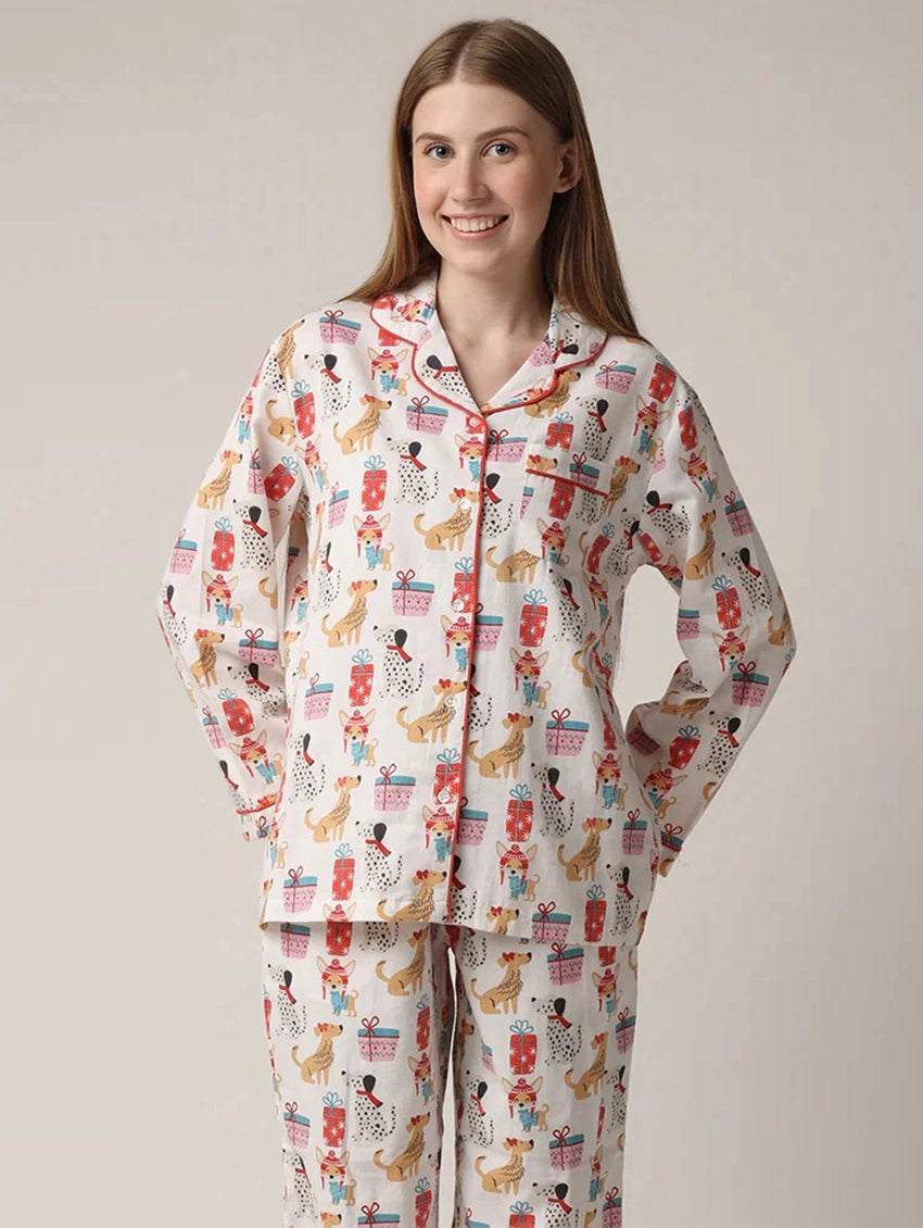 Embrace the holidays with this long sleeve button up top and pants PJ set in a cheerful print of Puppies and Presents! The adorable dogs are outfitted in scarves, hats and bows featuring a mix of red, pink and teal presents. This classic PJ set includes all the functionality you need for a cozy winter ahead.