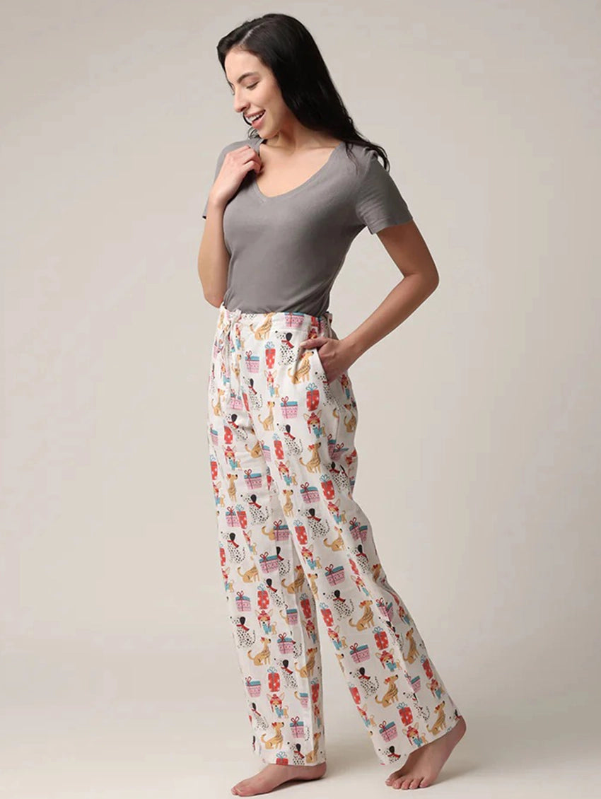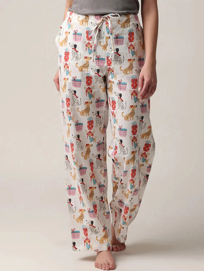 Embrace the holidays with these functional, quality sleep pants in a cheerful print of Puppies and Presents! These sleep pants come with a coordinated bag in the same print to make for easy gifting or treat yourself and get the matching bag as a bonus. Ultimate comfort with drawstring, elastic waist, and pockets!