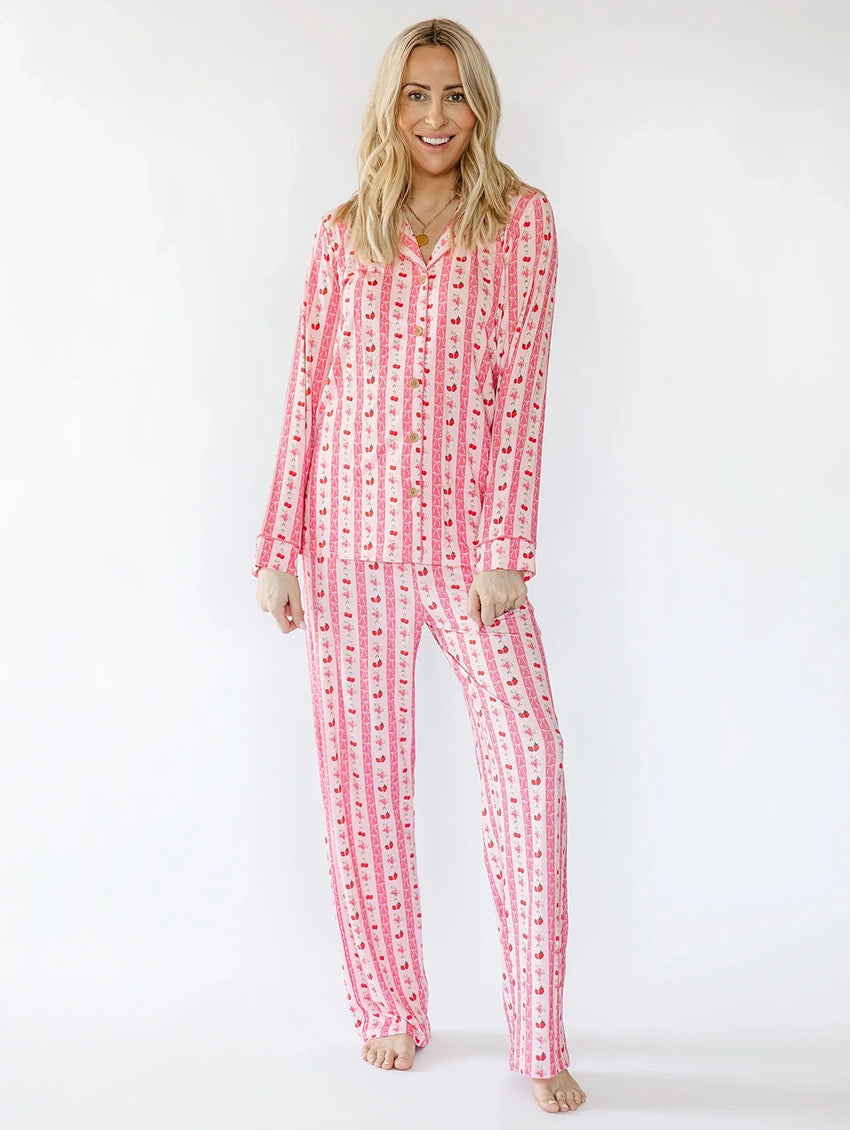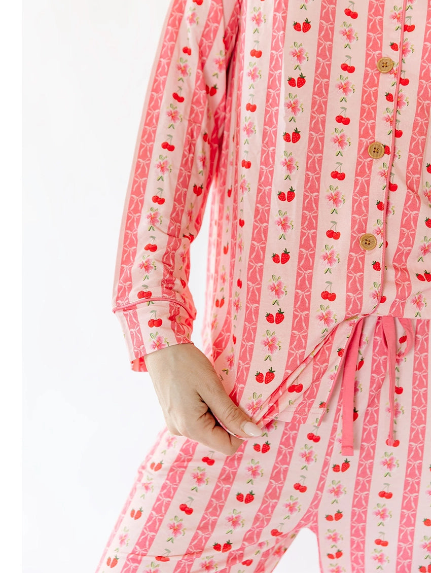 Bows, strawberries, cherries, and florals are what pink dreams are made of in the Sunset Snuggles Pj Set. Lounge or sleep in this dreamy pink set with long sleeve button up shirt, and pants with pockets and elastic tie waist.