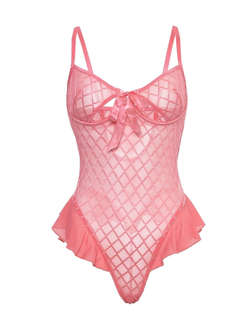 The Aubrielle Teddy from Oh La La Cheri is designed to tease. With peek-a-boo cups that tie and untie, flirty ruffle hips, and a diamond sheer mesh, this playful teddy is a fun addition to the bedroom.