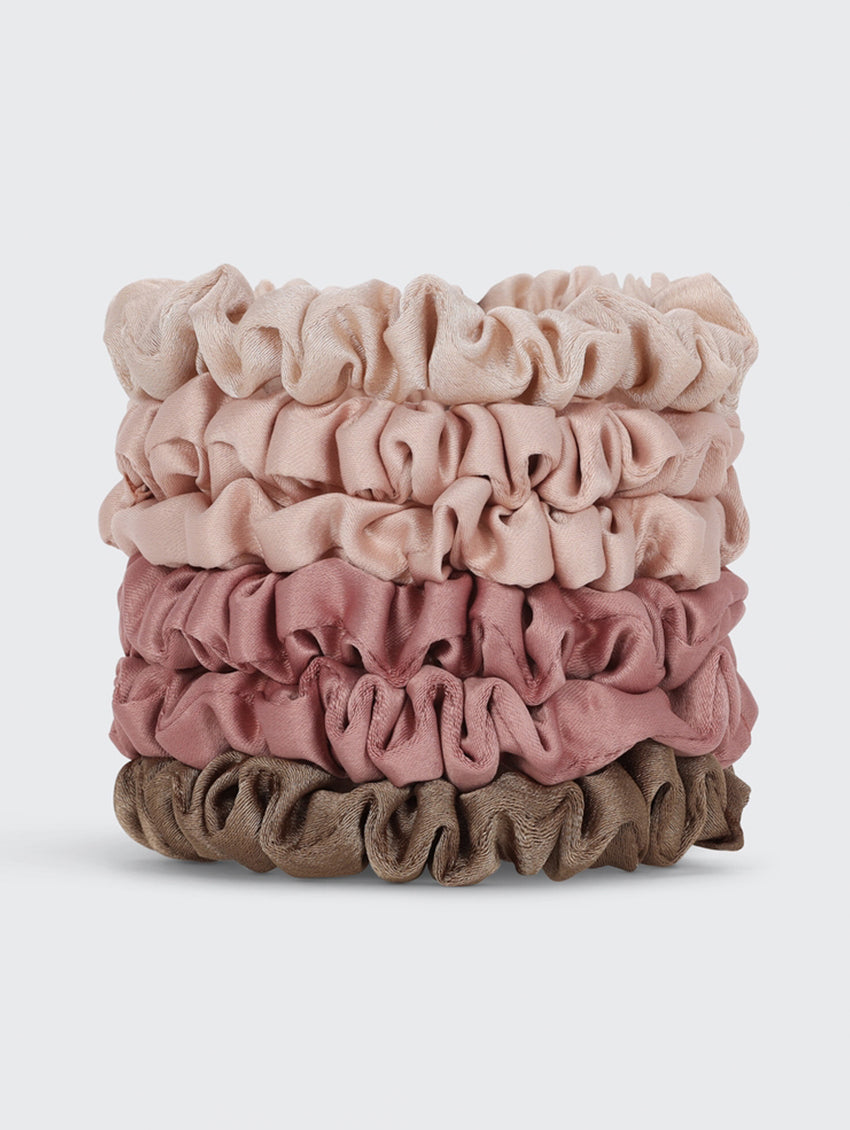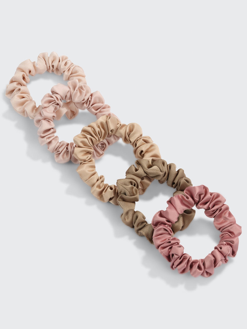 Add an extra touch to your everyday ponytail or bun with the Kitsch Ultra Petite Satin Scrunchies. This '90s fave is crafted with eco-friendly satin, making them gentle on your locks while helping to reduce damage and breakage. Plus, it won't leave behind creases in your hair thanks to the soft material! The slim, ruched design looks delicate and sleek for any occasion while keeping your hair under wraps (it also looks super cute worn on your wrist!). Comes in a pack of 6 chic neutrals that are ideal to grab, go, and match with any outfit. A pack of these are a great gift for you or for a friend!
