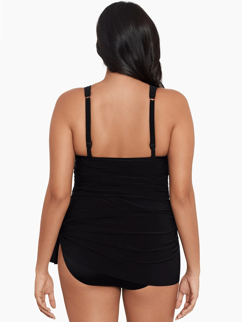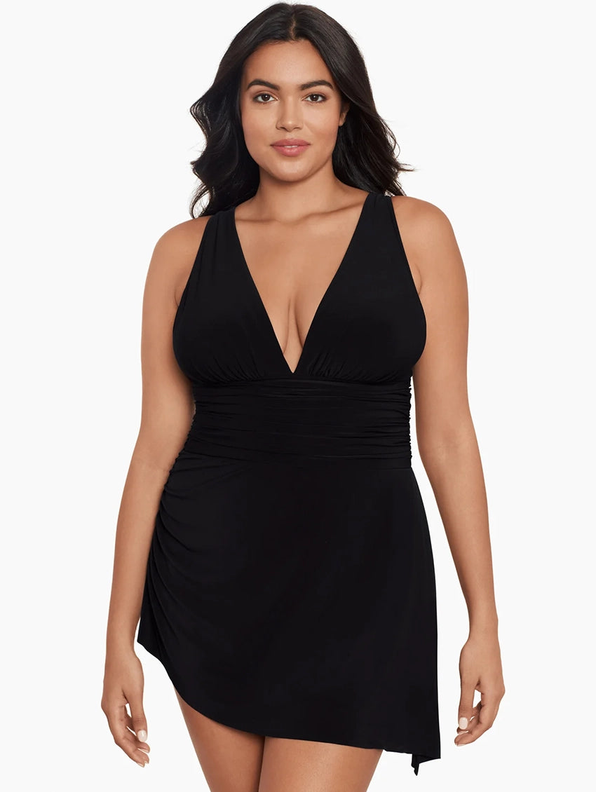 The Magicsuit Celine Swimdress is your new vacation secret weapon. This stunning little black Swimdress pairs a sexy plunge neckline and sleek silhouette with allover slimming control so you can feel secure and confident whatever the beach throws at you.