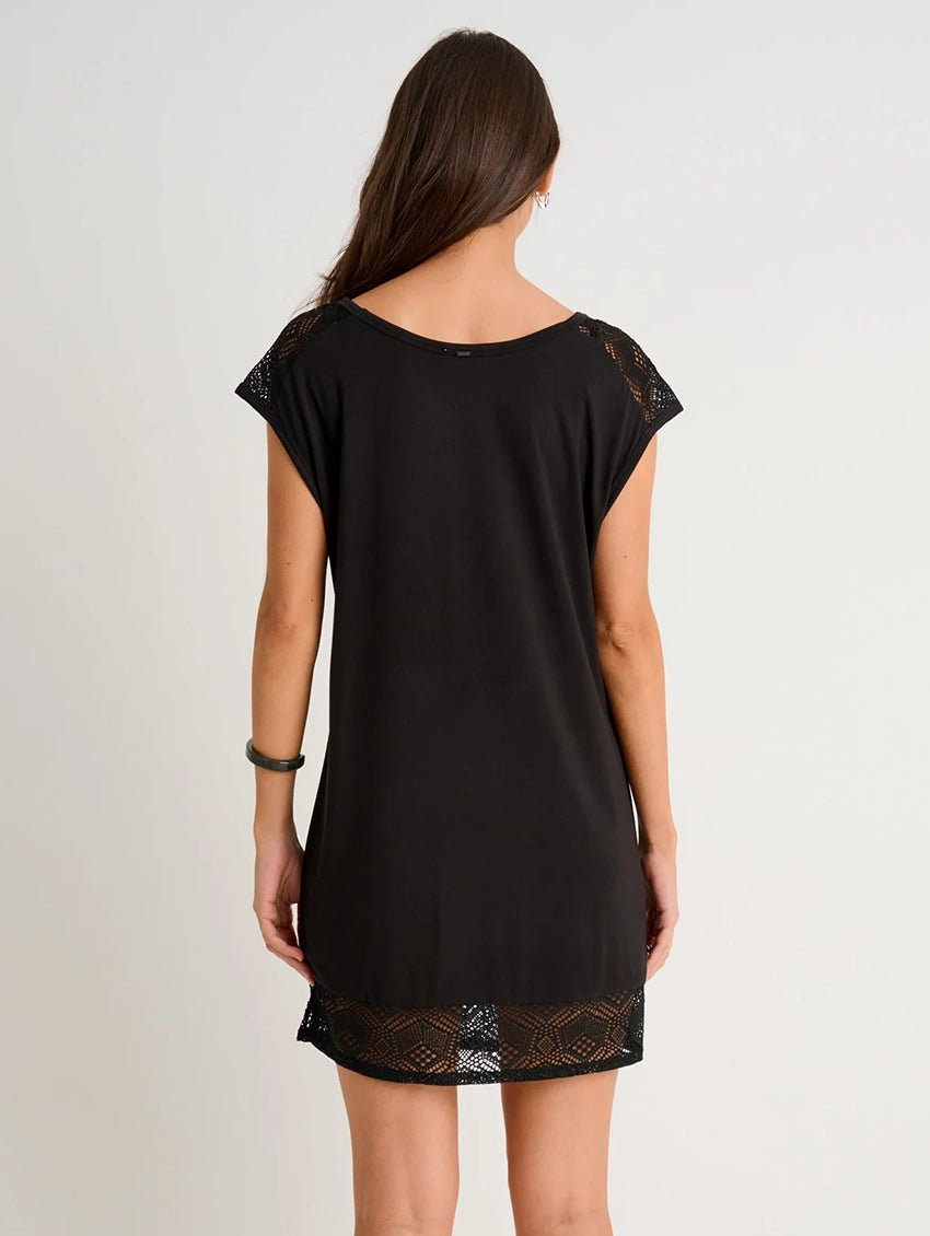 A cover up that takes you from the beach, to running your daily errands in the Everyday Sunday Mesh Cover Up Tunic. Featuring a soft jersey knit with crochet inserts at the sleeves and hem.