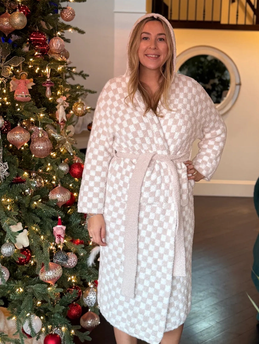 A soft, lightweight blanket that you can wear around the house in the Sunset Snuggles Hooded Robe. Featuring a cozy checker print fabric, hoodie for extra warmth, front pockets for your hands (or snacks), and an adjustable self tie belt.