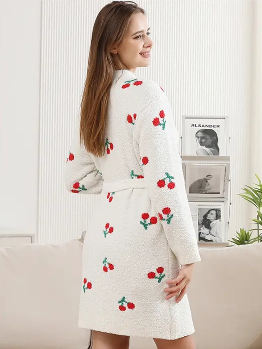 Treat yourself to some R&R in the Comfy Lux Short Cherry Robe. Featuring soft cherry print robe, front pockets, self tie belt, and mid thigh length.