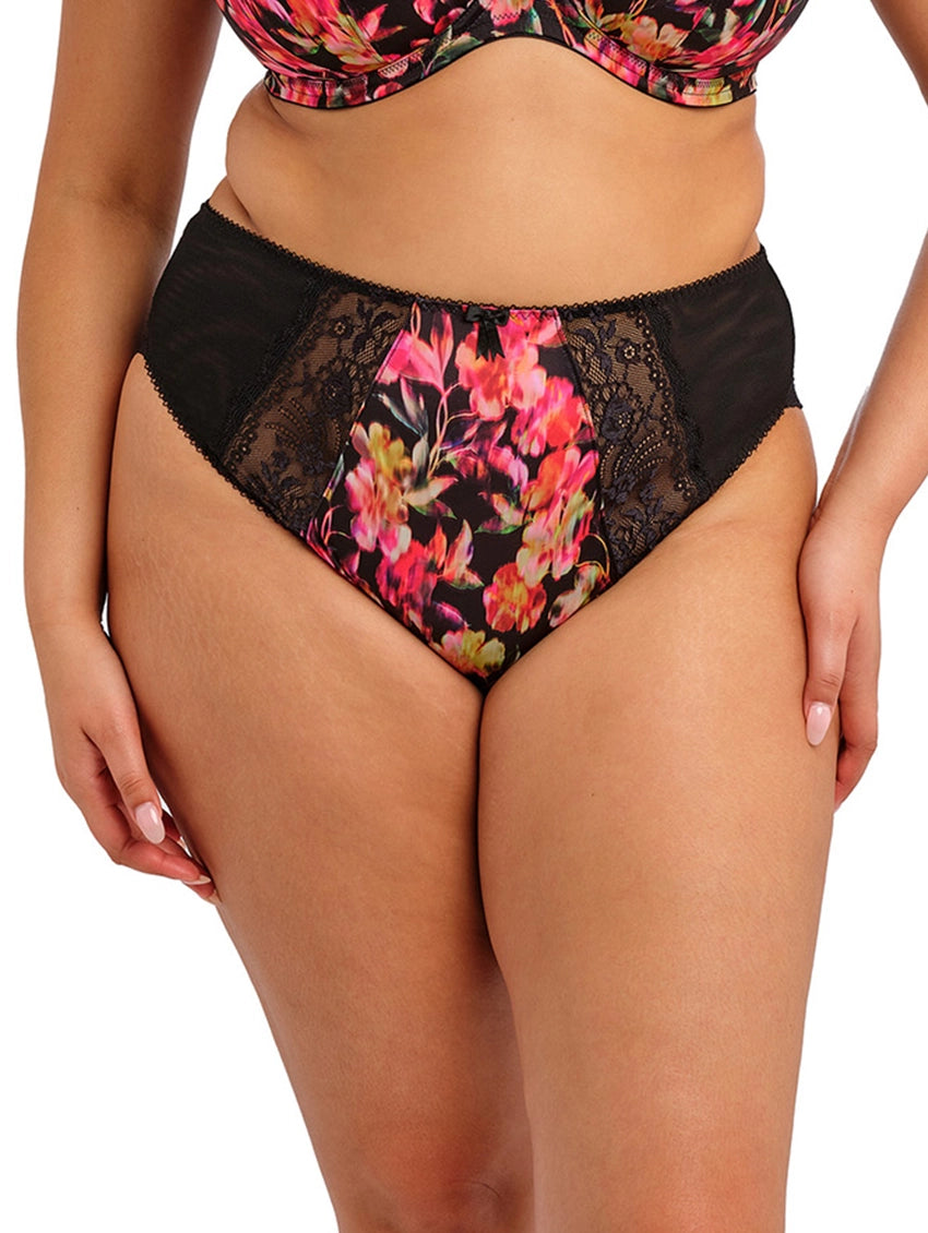 Elomi's popular style Morgan High Leg Brief, now in a new abstract floral print. Featuring high cut legs, stretch mesh and lace panels, and cheeky coverage.