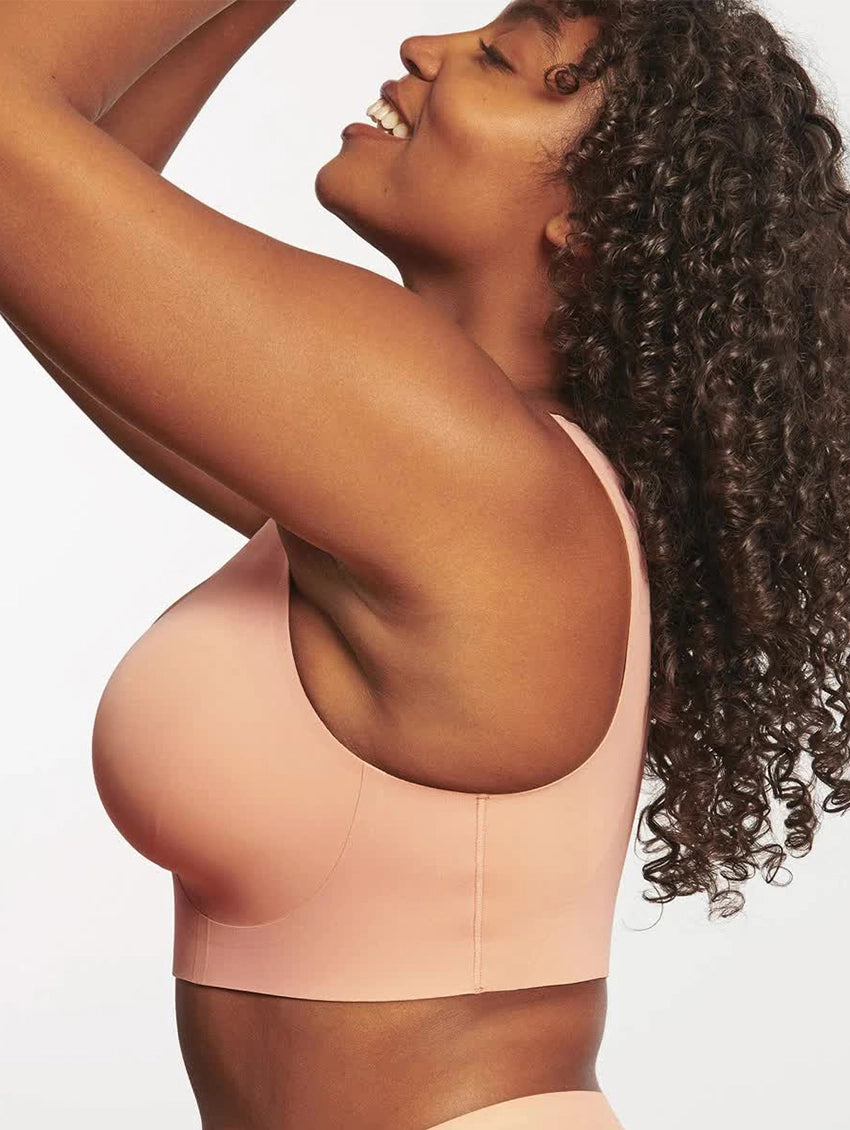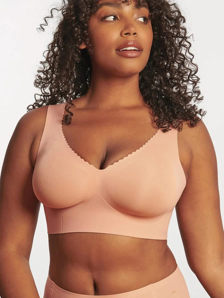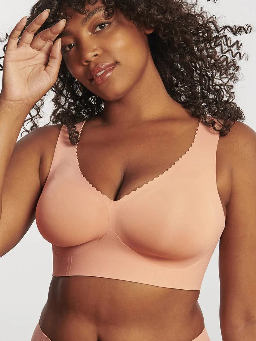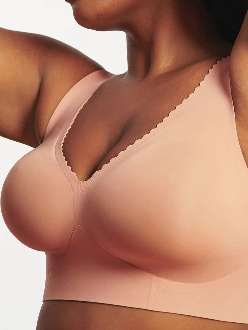 This great design from Evelyn & Bobbie features a deeper v-neck and scalloped edges in the front and back. It keeps the same smooth wireless lift as the Defy with elevated style and cleavage.