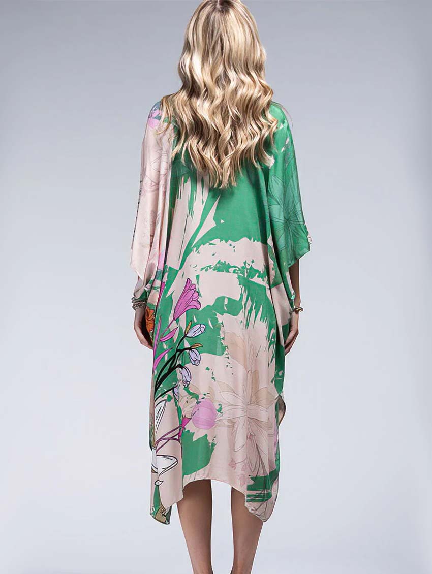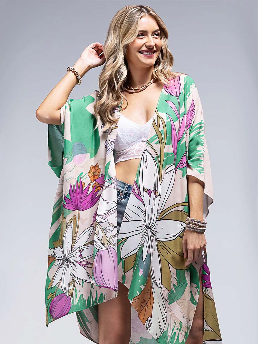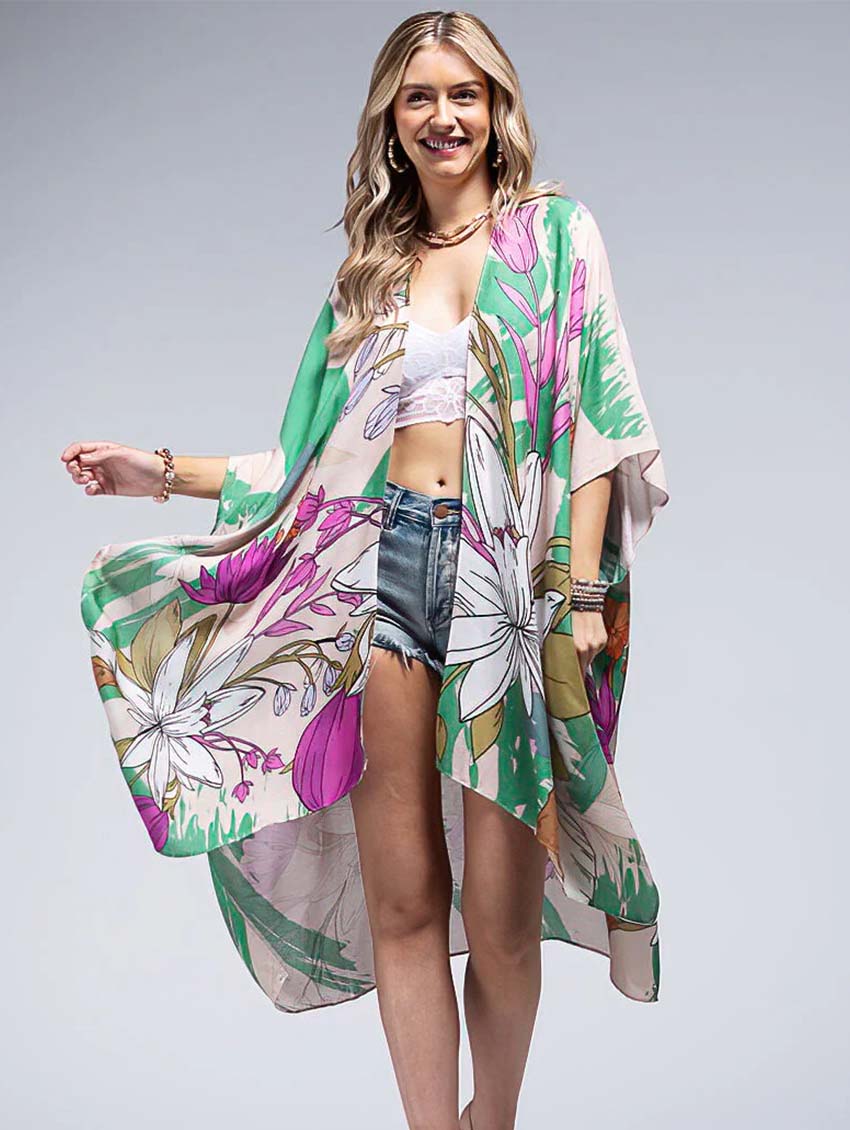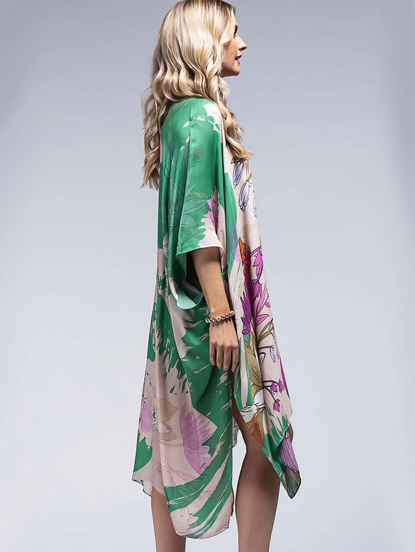 This retro floral cover up is a funky mix of bright colours that will spruce up even the simplest of bathing suits. This piece is sure to keep you cool and stylish this summer whether you're poolside, beachside, or taking a staycation.