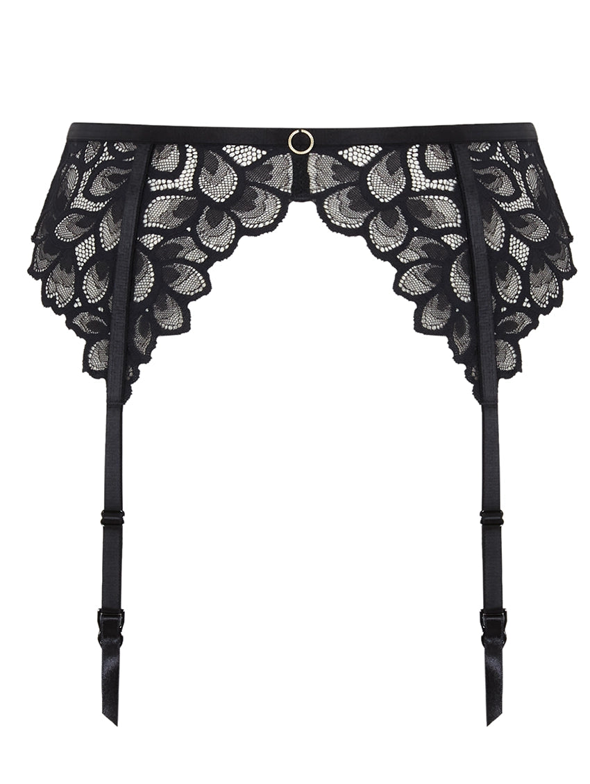 Complete the stunning Panache Allure set with the coordinating Garter Belt. This gorgeous patterned lace garter belt is super soft against the skin, with adjustable garter straps, a hook and eye back closure, and a dainty charm on the centre front.